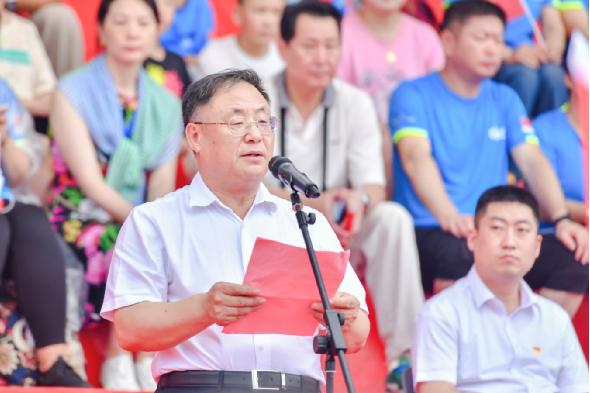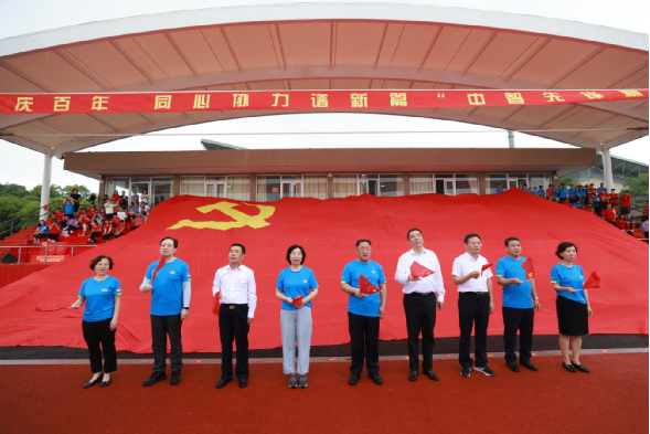 比賽間隙,組織了快閃活動,巨幅黨旗從主看臺鋪開,與會領導和全場高聲同唱《沒有共產(chǎn)黨就沒有新中國》,現(xiàn)場氣氛到達頂點。