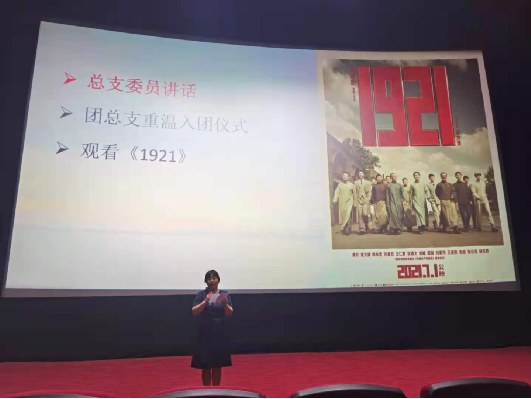 正式觀影前,首先由黨總支委員張淳玨開場致詞,簡單介紹了電影的歷史背景:“1921年,一群年輕人做了一件驚天動地的大事…”建黨100周年,正如影片封面上的那群年輕人,風華正茂正青春!